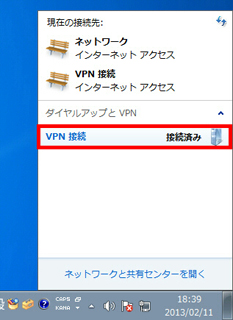 の画面の右下のネットワークのアイコンをクリックし、表示される画面内の VPN 接続設定アイコンをクリックします。VPN